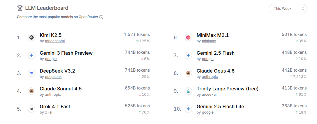 (取自:https://openrouter.ai/rankings 2026.02.13 排行搒)