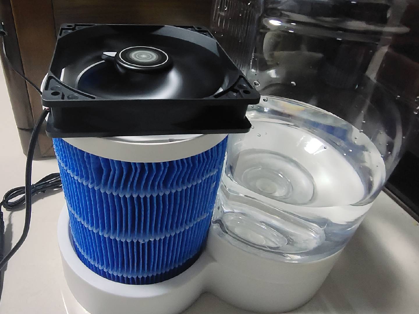 空间利用也是一个重要考量。从原理上看,这种冷蒸发加湿器占用最小空间的构成就是:水箱、滤芯、风扇,而且它们在空间上不能太重叠,否则就会出现“风直接吹到水面”这种效率低下的情况。这个方案在我尝试过的 DIY 里,算是最省空间的了,没有多余零件。