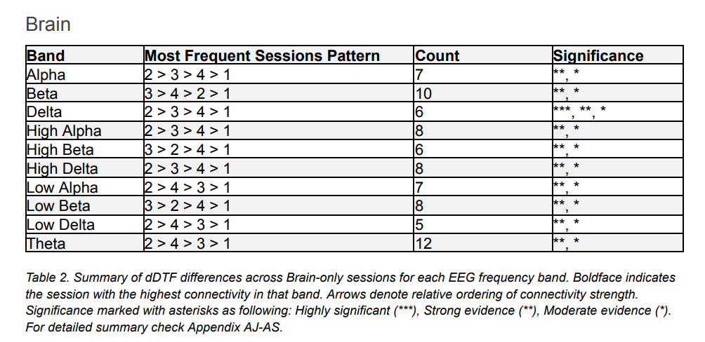 在仅脑组中,激活和连接性最为显著,该组在α、θ和δ波段中始终表现出最高的总 dDTF 连接性,尤其是在颞顶和前额执行区域。其次是搜索引擎组,该组在整个大脑的总连接性上显示出约 34-48% 的降低,具体取决于频率带,尤其是在低频范围内。LLM 组显示出最少的连接性,在低频语义和监控网络中,与仅脑组相比,整体 dDTF 幅度减少了多达 55%。