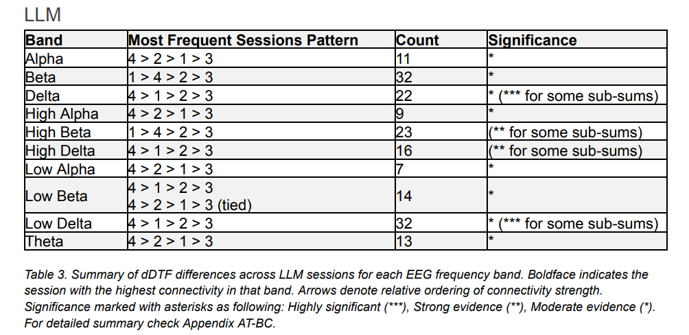 - 关键认知环节的缺失:研究指出,LLM 使用者α和β波网络的参与不足,这可能意味着他们跳过了自主构思和组织策略的关键过程。